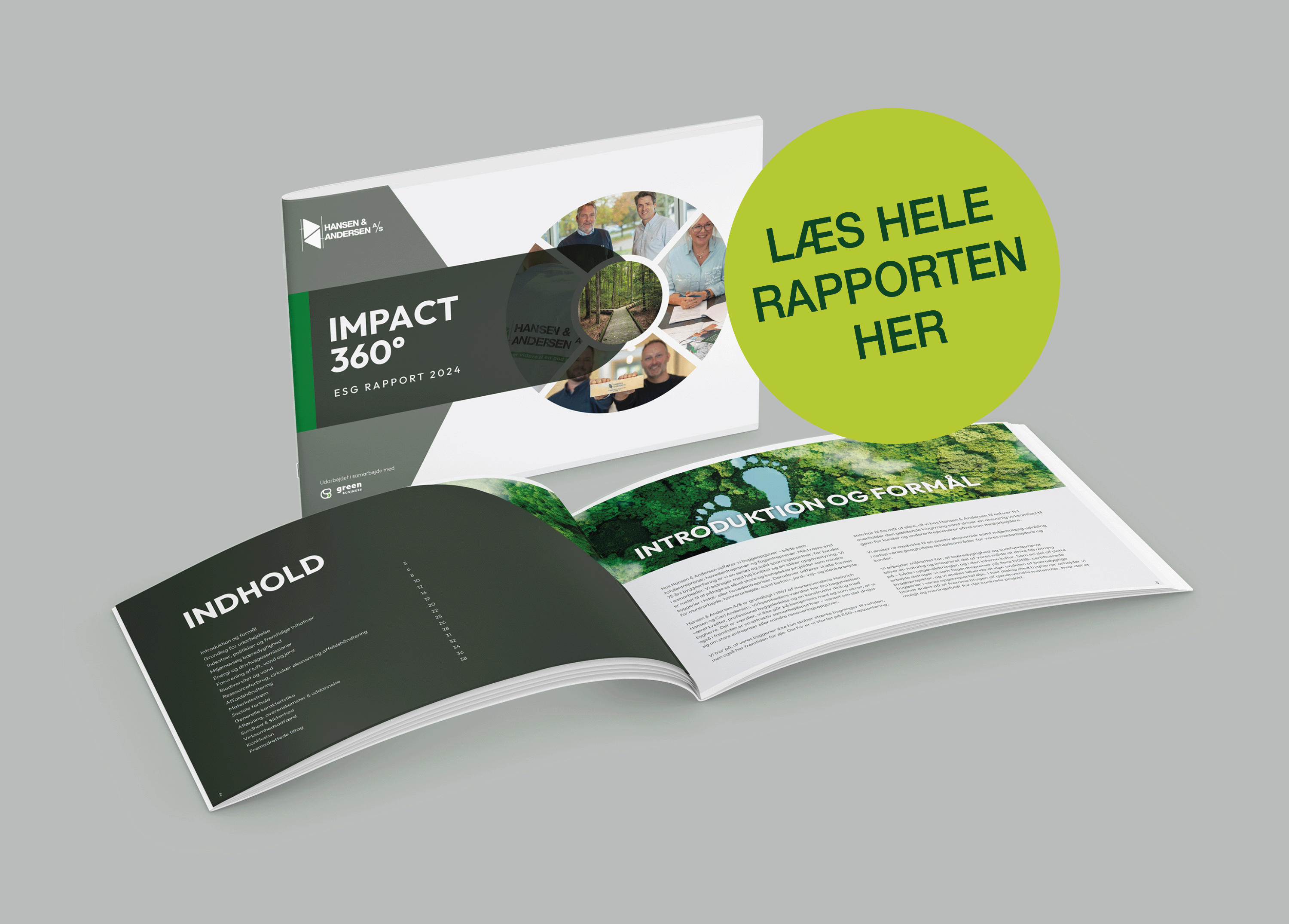 Bygge- og anlægsbranchen er kendetegnet ved betydelige miljøpåvirkninger - særligt i relation til energiforbrug, CO₂-udledning, materialeforbrug og affaldshåndtering. Denne ESG Rapport er et skridt mod en grønnere fremtid og den rigtige retning for Hansen & Andersen A/S. Rapporten hjælper os med at få et overblik over hvor vi står, og hvor vi kan blive bedre. Samtidig ønsker vi aktivt at tage medansvar for den miljømæssige udvikling i byggebranchen.