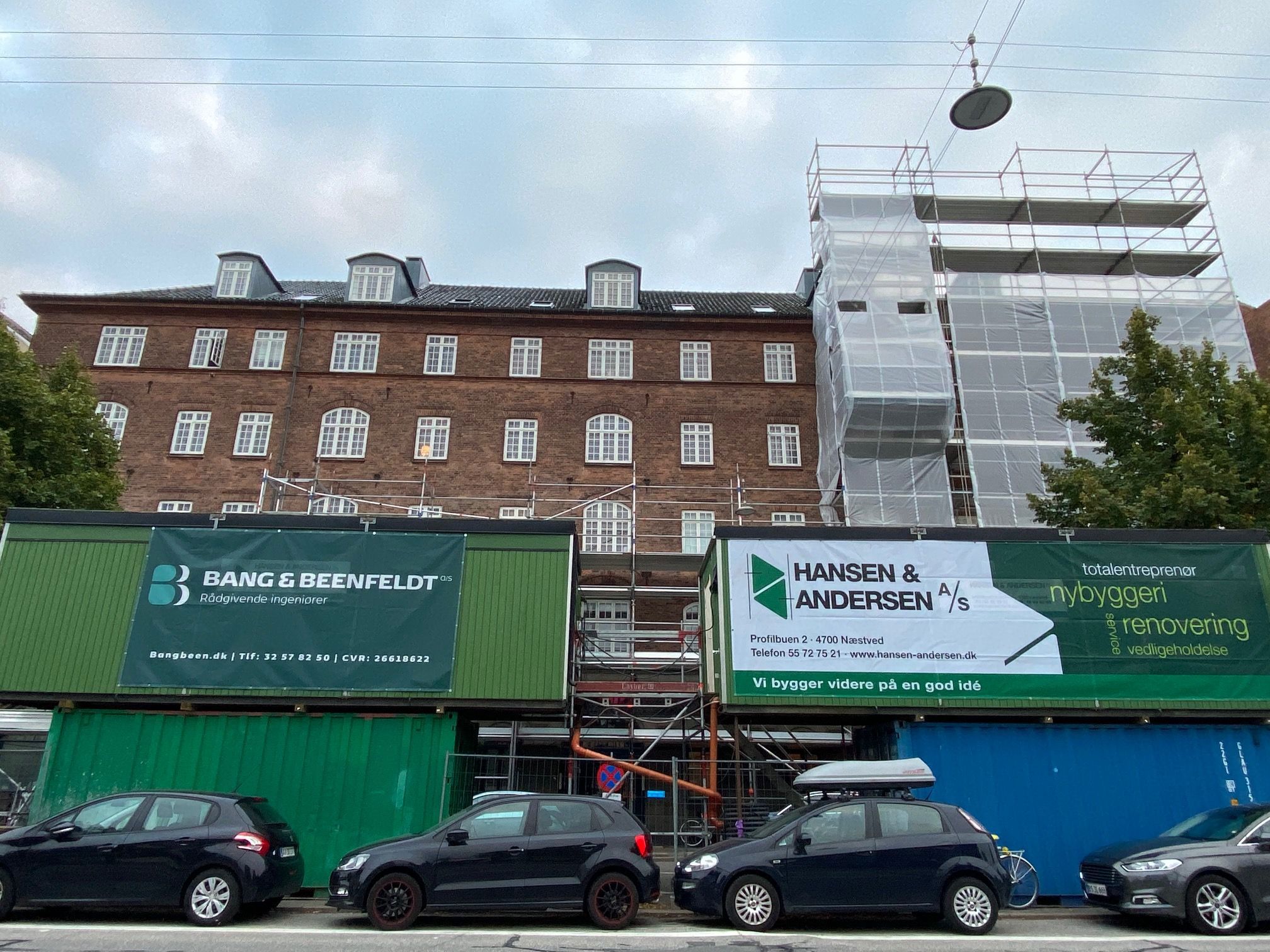Vi har stået for udførelsen af en totalrenovering af både facader, vinduer samt tag. Vinduernes udskiftning blev til nye energi- og lydvinduer, som skal optimere bygningens samlede energimærke. Udskiftningen af tegltaget, som også bestod af etablering af 300 mm isolering, blev med flotte blådæmpede tegl, som blev lagt i mørtelrygning.