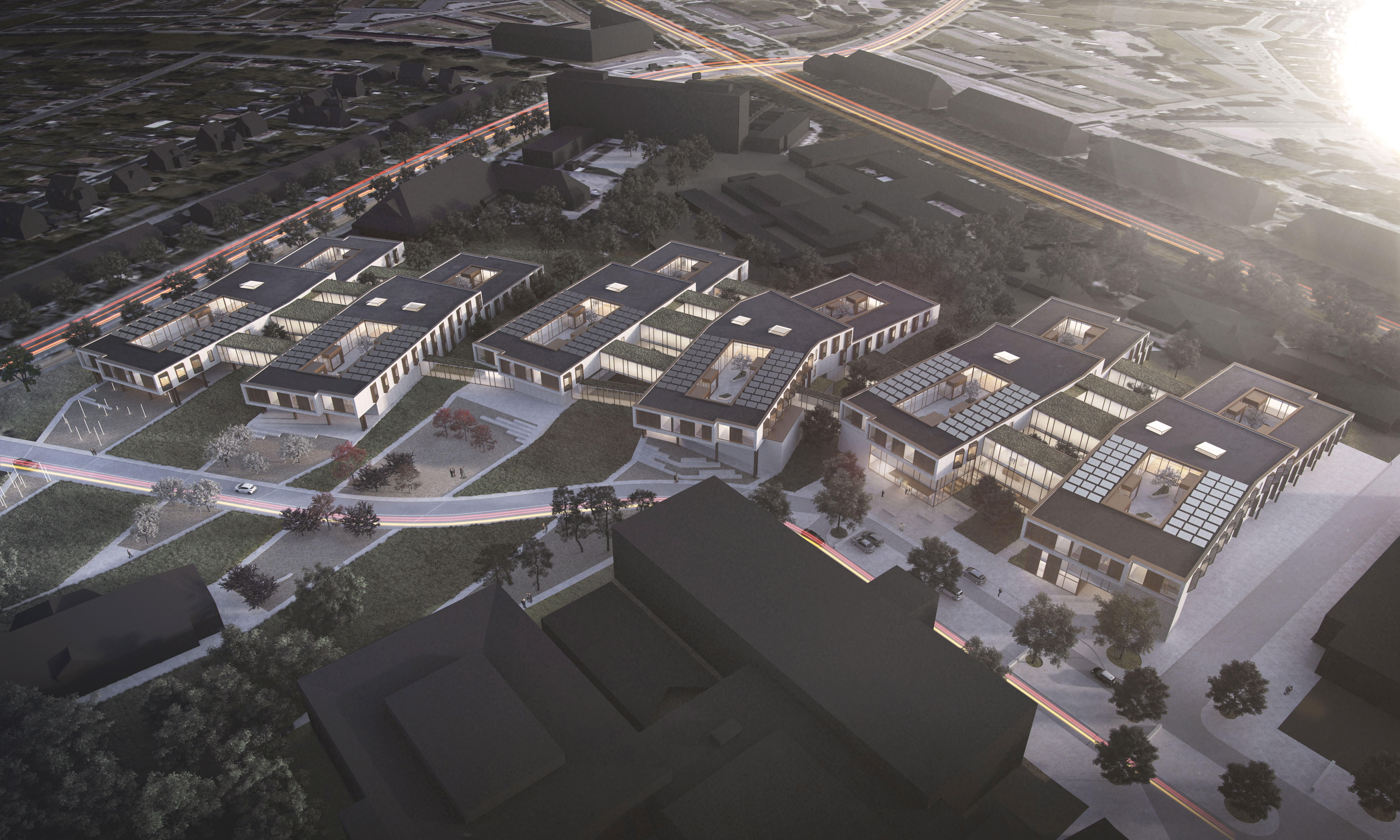 Det arkitektoniske hovedgreb – udviklet af PLH Arkitekter i samarbejde med Friis & Moltke – nedbryder det store kompleks i mindre enheder, inspireret af de historiske pavillonbygninger i parken omkring Bispebjerg Hospital. De nye bygningskroppe placeres som rektangler i to plan, asymmetrisk i terrænet og bundet sammen af grønne landskabsbånd, som trækker naturen helt ind mellem husene.