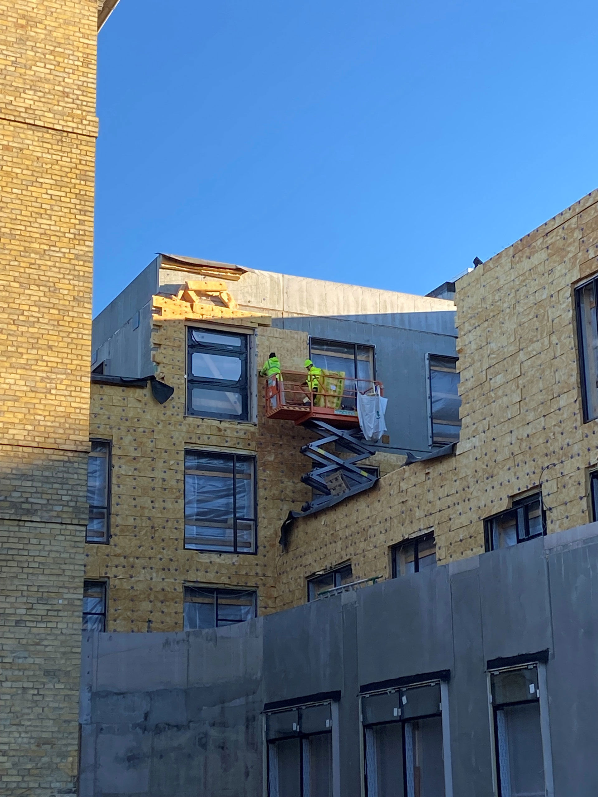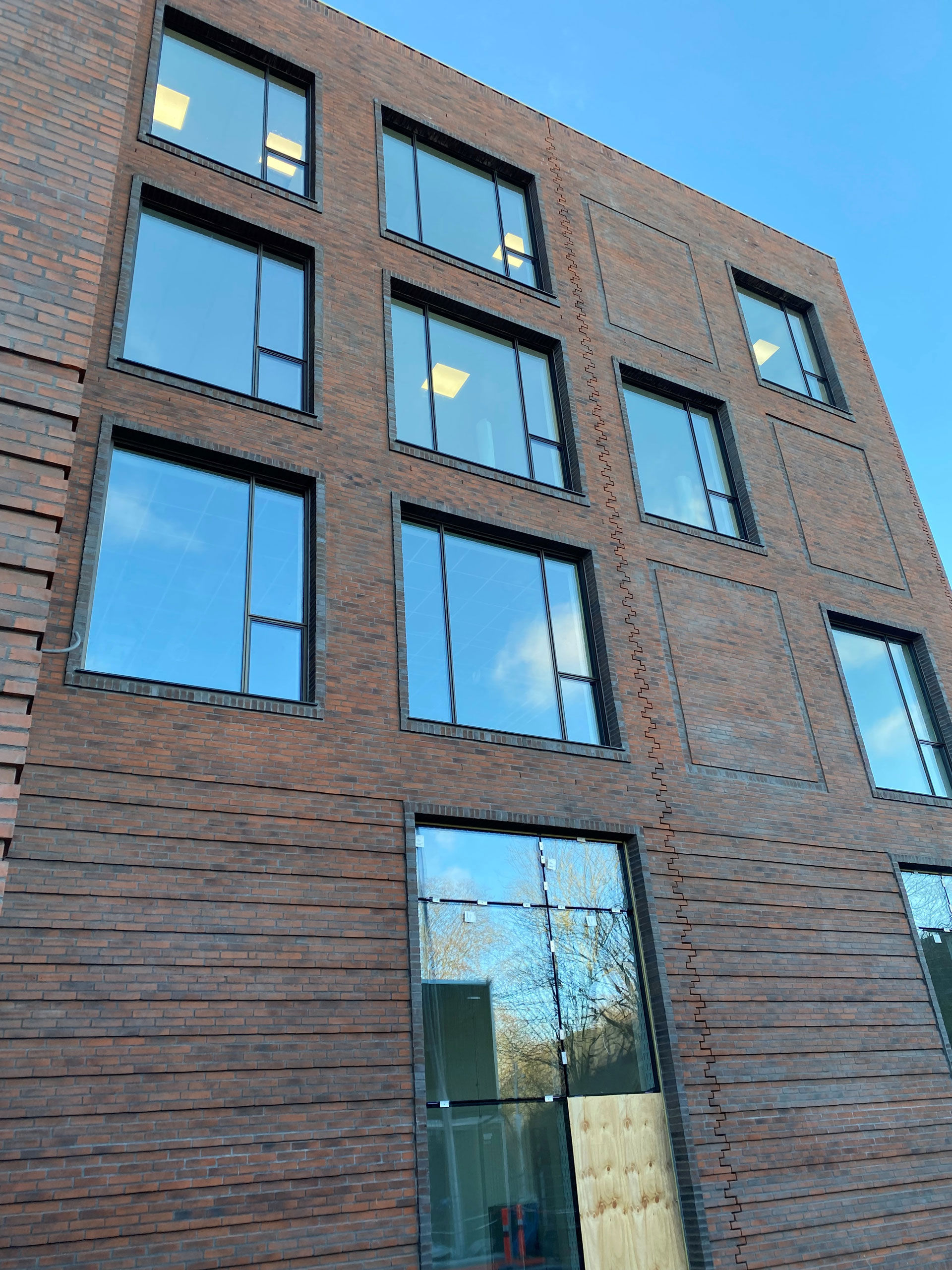 Vores arbejde til projektet stiller høje krav til vores murere, idet projektet består af mange smukke detaljer. Mursten omkring vinduer og døre er skiftet i forbandt, som skal blive til rulleskift, der danner rammerne om vinduerne.